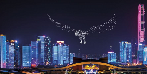在無人機的點綴下,夜空中的無人機在排序布列下幻化成深圳燕子湖國際會展中心,夜空中的金花轉動成展館形狀的禮盒,禮盒上的絲帶展開,呈現了本會展覽內容豐富,精彩紛呈,這在無人機的點綴下,代表著深圳文化的醒獅,吐出了深圳現代城市的城際天際線,可以看出,深圳展現出了全球化、多樣性和包容性。