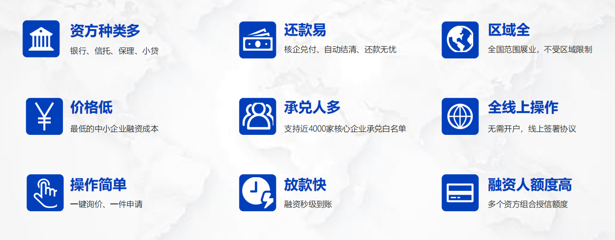 3、融資額度高、到期還款易 :融資人享受多個資方組合授信額度,核心企業兌付,到期自動結清、還款無憂。